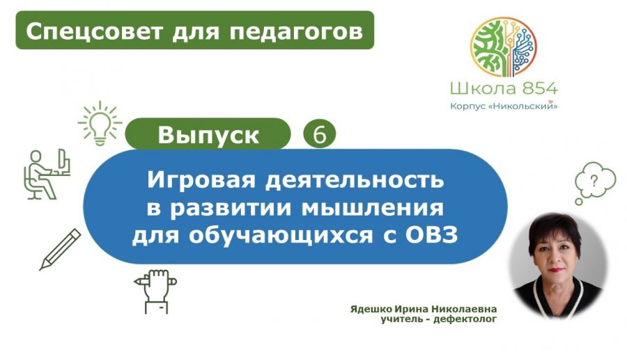 Учитель-дефектолог Ирина Николаевна Ядешко сегодня расскажет о «Роли игровой деятельности в развитии мышления для обучающихся с ОВЗ»